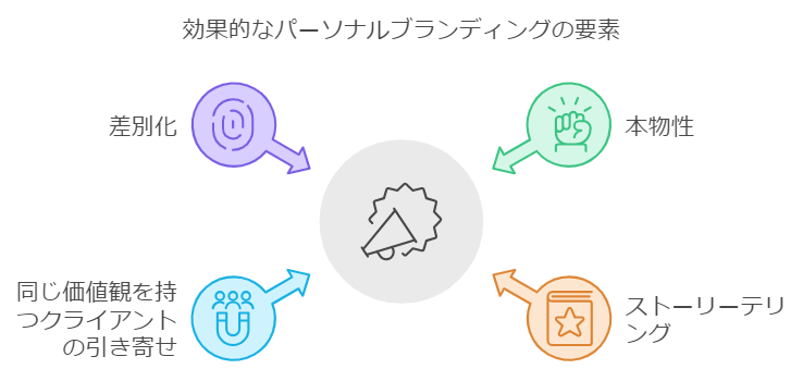 パーソナルブランディングは、自分自身のユニークな価値提案を市場に訴える方法です。私自身のプロフィールでは、自然体とストーリーテリングを中心に据え、これが私のブランドの核となっています。これにより、同じ価値観を持つクライアントが自然と引き寄せられます。個性を前面に出すことで、類似のサービスを提供する他の専門家と差別化を図り、記憶に残りやすくなります。
